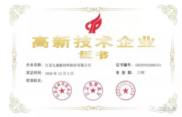 九鼎新材通過江蘇省高新技術(shù)企業(yè)復(fù)審