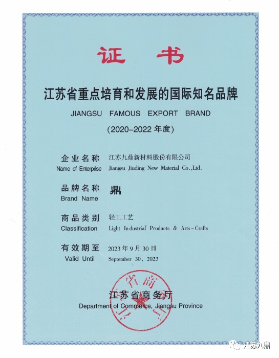 江蘇九鼎新材料股份有限公司“鼎”牌再度獲得《江蘇省重點培育和發(fā)展的國家知名品牌》,這是九鼎新材自2007年以來連續(xù)十四年獲此殊榮。